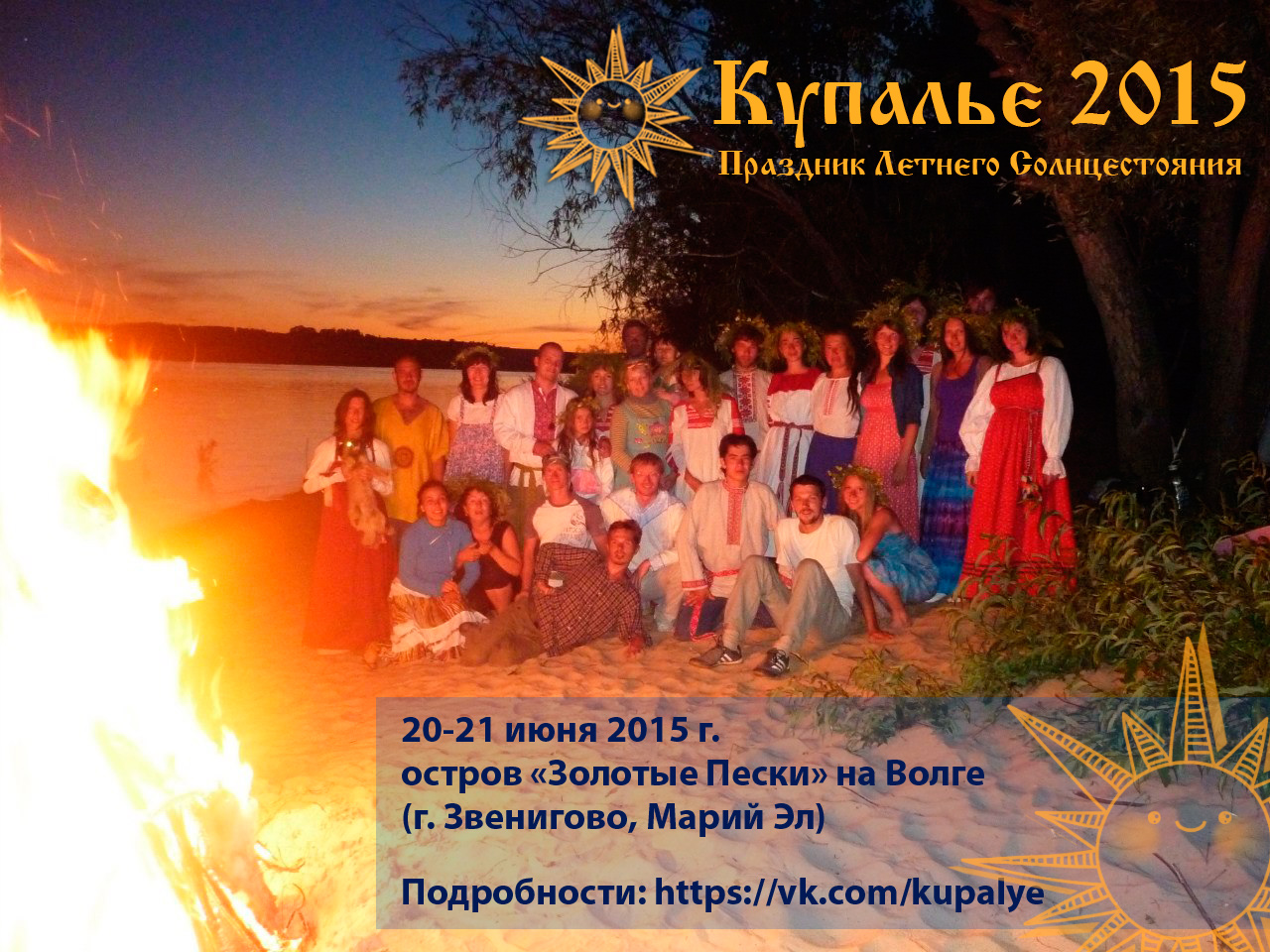 Купалье - это волшебное время, когда вода наполнена живительной энергией, огонь способен очищать, а травы обретают особую силу. Не пропустите это торжество жизни! Днём вас ожидают настоящие приключения: для детей - увлекательная игра-квест с поиском клада, для взрослых - верёвочные курсы, и для всех – отдых на прекрасном острове, купание в Волге, общение с интересными людьми. А вечером мы проведём древний купальский обряд, зажжём волшебный костёр, пустим плотики со свечами по реке, и будем отмечать праздничную ночь танцами, песнями и играми – как оно было заведено на Руси. Будет весело!